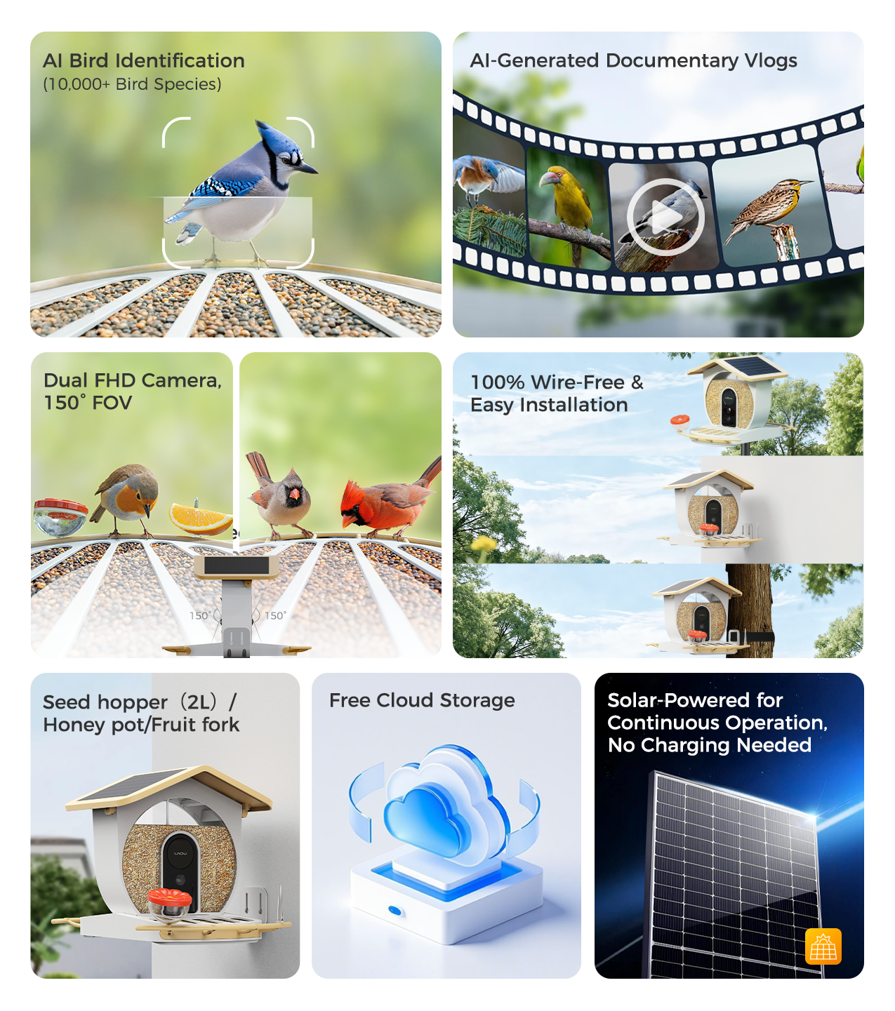 LNDU 双目智能喂鸟器作为全球首款背对背双目全景监测与集成 AI 影像二次处理,专为家庭庭院场景打造的创新产品,它以 “观测 - 记录 - 剪辑 - 分享” 一站式系统,重新定义探索庭院自然体验,让用户每一次观鸟都成为自然的杰作,更彰显了在 “观鸟经济” 崛起背景下的产品创新高度。